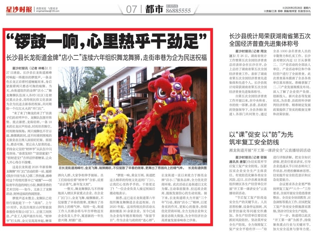 星沙时报2月27日讯(记者 林畅)2月27日清晨,长沙县长龙街道湘峰村响起一阵激昂的锣鼓声,一条金色长龙正沿着村道蜿蜒而来,身后紧跟着两只憨态可掬的瑞狮。当天,由街道组织的金牌“店小二”舞龙舞狮队伍深入各村(社区)及辖区重点企业,用传统民俗文化表演为企为民送去新春的祝福,共同期盼一个红红火火的“开门红”。