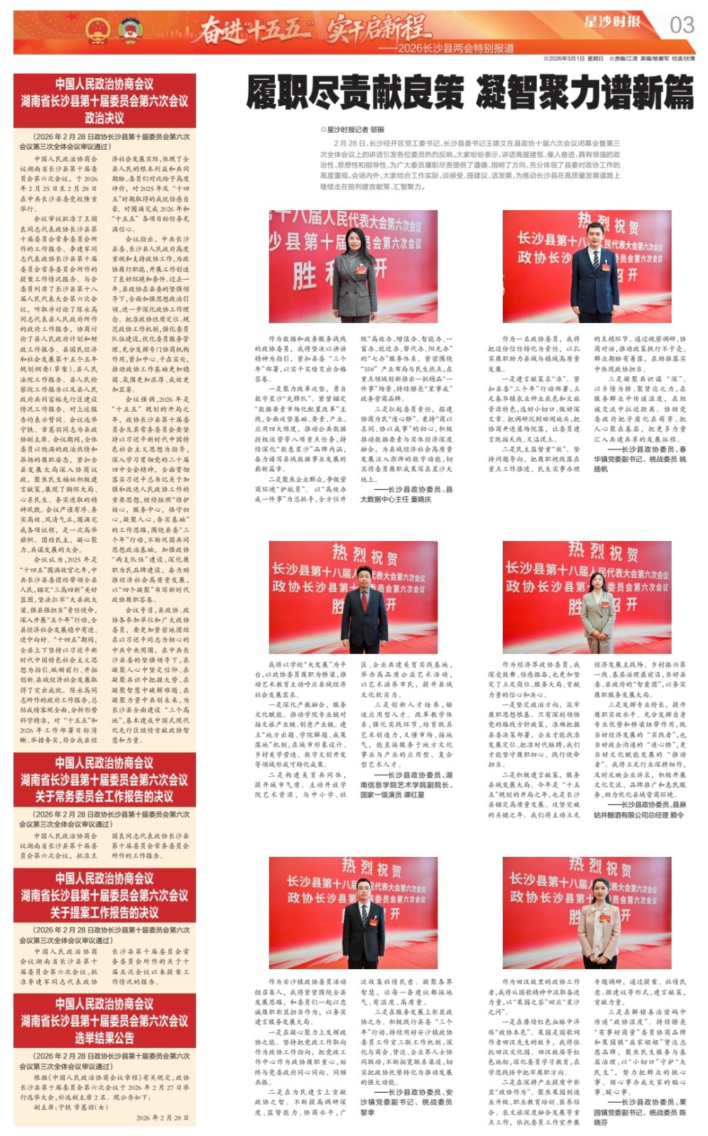 二是积极建言献策,服务县域发展大局。今年是“十五五”规划的开局之年,也是长沙县锚定高质量发展、攻坚突破的关键之年。我们将主动立足经济发展主战场、乡村振兴第一线、基层治理最前沿,当好县委、县政府的“智囊团”,以务实履职服务发展大局。