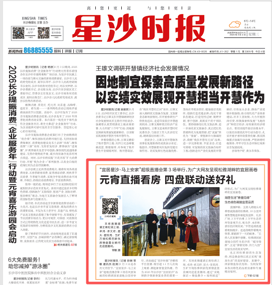 星沙时报3月3日讯(记者 彭娴 常敏 通讯员 赵清)3月3日是农历元宵佳节,“宜居星沙·马上安家”超级直播会第3场在风景如画的松雅湖国家湿地公园旁举行。活动通过“星沙时报”全媒体平台直播,吸引超1.1万人次线上观看,掀起新春置业热潮。作为2026年长沙县“宜居星沙”品牌推介暨新春置业季的重要一环,本场直播邀请正商松湖上境、卓鸿·承文府、星大·星悦湾、五矿万境松雅四家优质楼盘置业顾问走进直播间,通过“实地探访+楼盘推介+福利派送”的形式,为广大网友呈现松雅湖畔的宜居画卷。