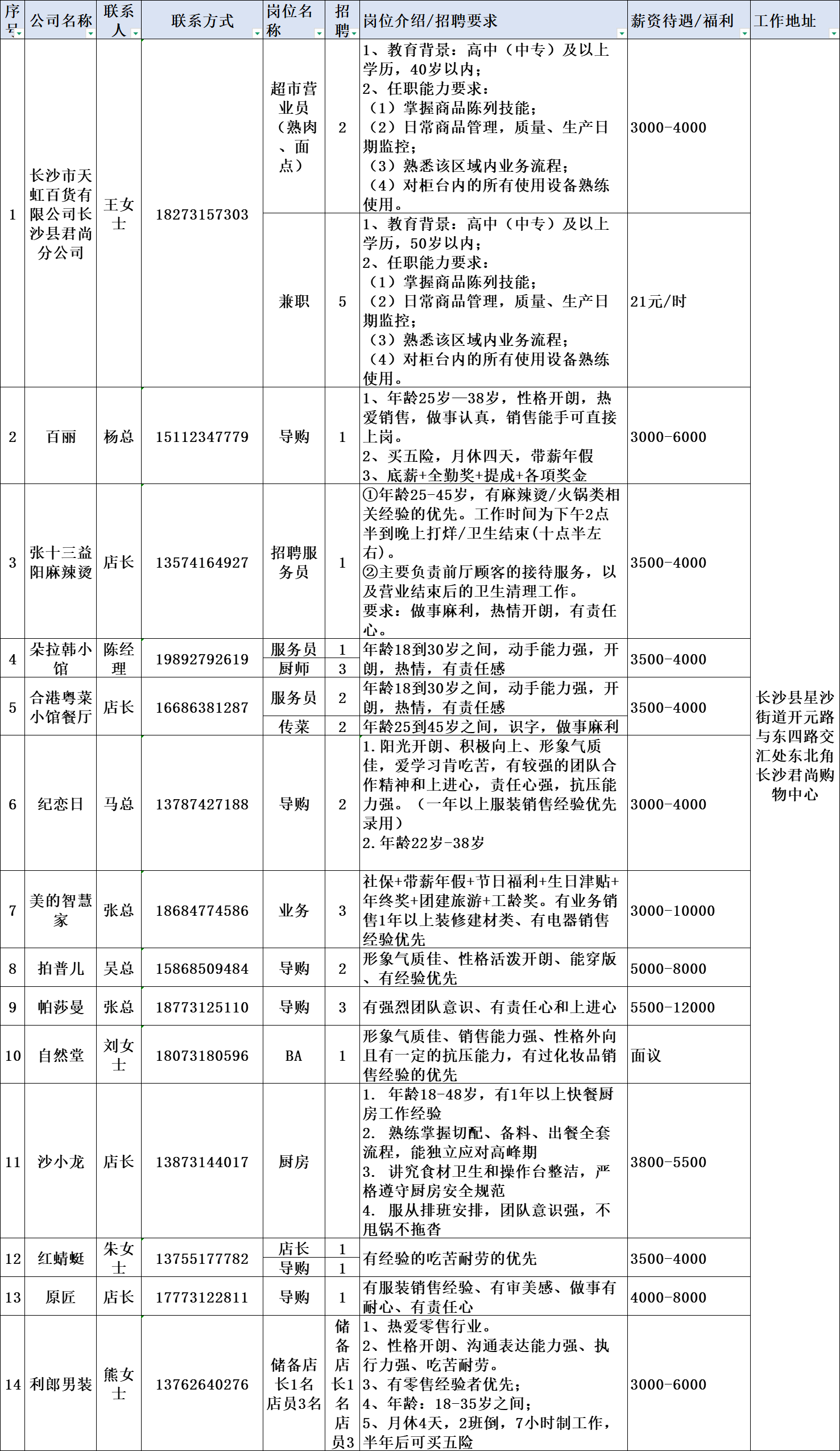 君尚购物中心专场招聘会岗位清单