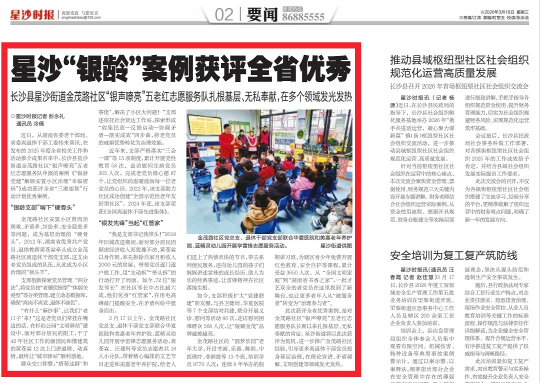 近日,从湖南省委老干部局、省委离退休干部工委传来喜讯,在发布的2025年度全省相关工作和活动推介成果名单中,长沙县星沙街道金茂路社区“银声嘹亮”五老红志愿服务队申报的案例《“银龄党建”解锁安置小区治理“幸福密码”》成功获评全省“三湘银智”行动计划优秀案例。