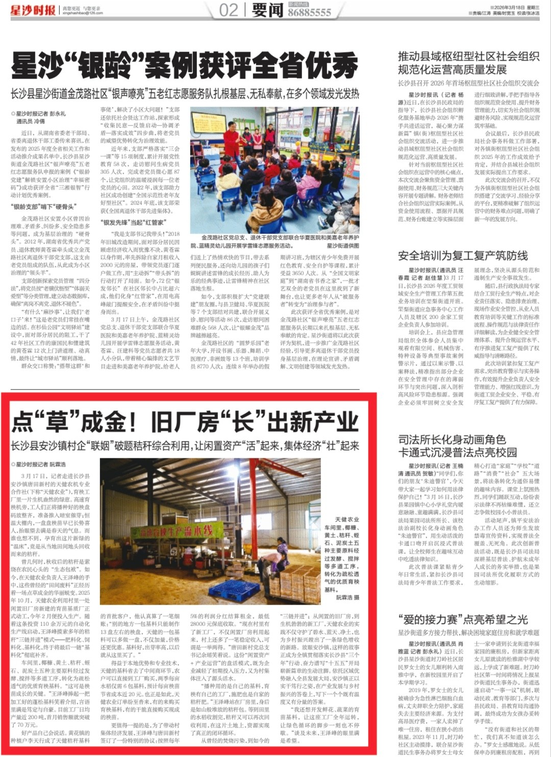 从曾经的焚烧污染,到如今的“三链并进”;从闲置的旧厂房,到生机勃勃的新工厂,天健农业的实践不仅守护了碧水、蓝天、净土,也为乡村振兴蹚出了一条绿色增收的新路。放眼安沙镇,这样的故事正成为全镇贯彻落实长沙县“三个年”行动、奋力谱写“十五五”开局崭新篇章的生动注脚。依托区域优势融入全县发展大局,安沙镇正以实干笃行之姿,在产业发展与乡村振兴的答卷上,写下一个个既有温度又有分量的答案。