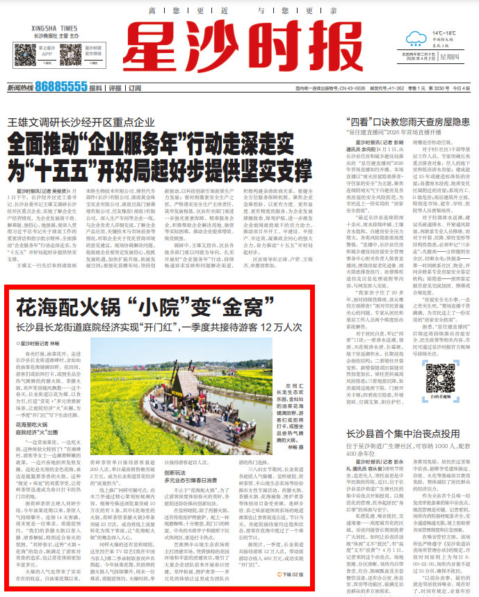 春光烂漫,油菜花开。走进长沙县长龙街道湘峰村,金灿灿的油菜花海铺满田野。花田间,游客们或拍照打卡,或围坐品尝热气腾腾的药膳火锅、茶膳火锅,欢声笑语随风飘散……这个春天,长龙街道以花为媒、以食为引,打造“赏花+”多元消费新场景,让庭院经济“火”出圈,为一季度“开门红”写下生动注脚。