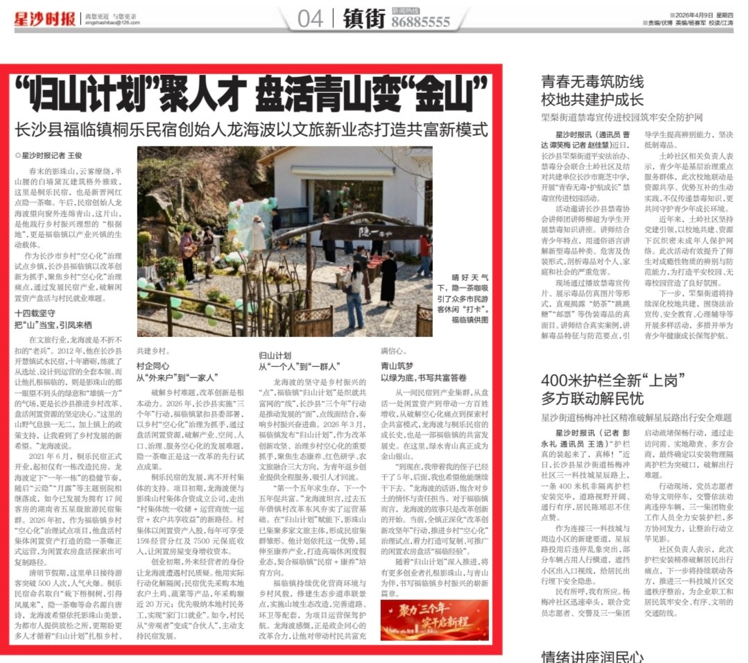 龙海波的坚守是乡村振兴的“点”,福临镇“归山计划”是织就共富网的“线”,长沙县“三个年”行动是推动发展的“面”,点线面结合,奏响乡村振兴奋进曲。2026年3月,福临镇发布“归山计划”,作为改革创新攻坚、治理乡村空心化的重要抓手,聚焦生态康养、红色研学、农文旅融合三大方向,为青年返乡创业提供全程服务,吸引人才回流。