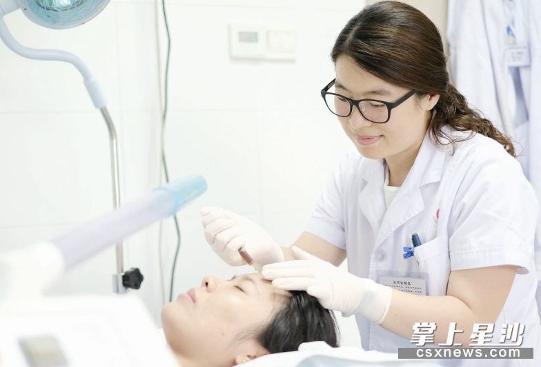 (5月21日,长沙市中医医院(长沙市第八医院)皮肤科主治医师王青为患者做皮肤治疗。章帝 摄)