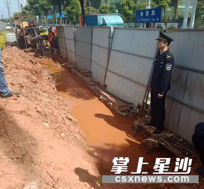 执法人员调查发现,原来是一组施工队伍正在进行自来水管道施工改造。为了省事,赶工期,在未经市政工程行政主管部门审批的情况下,项目方组织施工人员对此处的城市道路进行挖掘。现场部分绿化带已被挖开损毁。施工时产生的泥浆水,未经过任何沉淀就直排到路边的雨水井,排放量约3立方米。