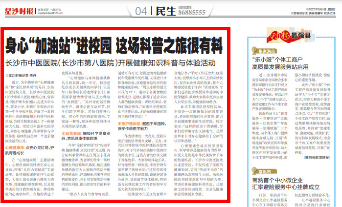 近日,为积极响应“心理健康周”和“全民营养周”的号召,弘扬中医传统文化,长沙市中医医院(长沙市第八医院)集结心理、营养及中医护理专家团队,走进天华小学、黄龙小学、东雅中学和长沙县第一中学圣和学校,开展了一系列别开生面的健康知识科普与体验活动,为师生和家长送上了一份健康大礼包。活动以丰富多元的形式,聚焦心理健康、科学营养与中医养生,如春日细雨般滋润校园里每一个追求健康生活的心灵。