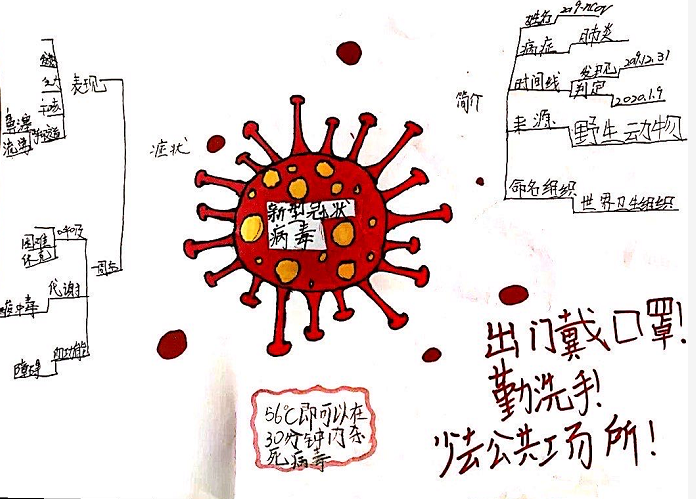 星沙时报2月9日讯(记者 潘东晓 通讯员 晋小梨 陈广)“瞧!孩子们在用思维导图帮助大家合理认清病毒真面目。”近日,一幅幅疫情防控思维导图宣传画成为了长沙县果园镇果园小学各年级微信群纷纷点赞的焦点。小学生们用五颜六色的画笔详细具体地描写了新冠肺炎的典型症状、传播途径、预防措施,一个个简笔画穿插其中,逻辑清晰又不失趣味地展现了疫情防控阻击战中童心的力量。