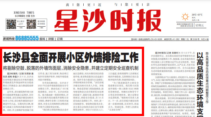 为有效化解风险,长沙县于2023年启动外墙脱落隐患安全专项整治工作,推动完成了565栋隐患整治。2025年,长沙县再加压,强力推动新一轮排查整治,并为全县既有高层建筑外墙购买安全保险,聘请专业第三方机构开展排查,对业主启用维修资金整治的外墙予以保险资金补贴。