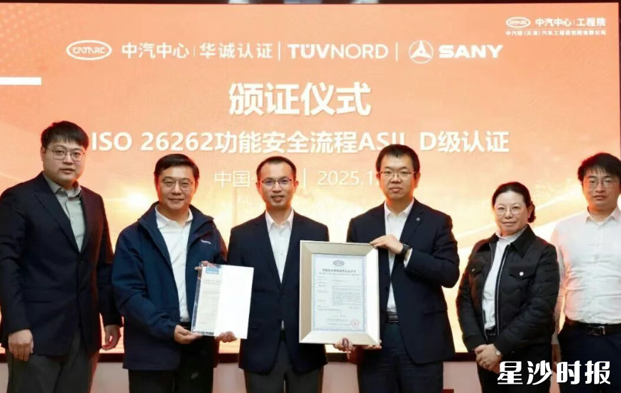 星沙时报12月4日讯(记者 周浩然)近日,三一重卡功能安全体系建设及认证项目顺利通过中汽研华诚认证与TÜV北德(欧洲)联合终审,成功拿下两大权威机构功能安全认证证书。