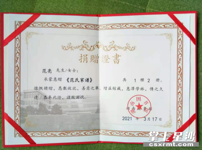 星沙时报3月18日讯(记者 吴涛)3月17日,长沙县金井镇《范氏家谱》被湖南省图书馆收藏。