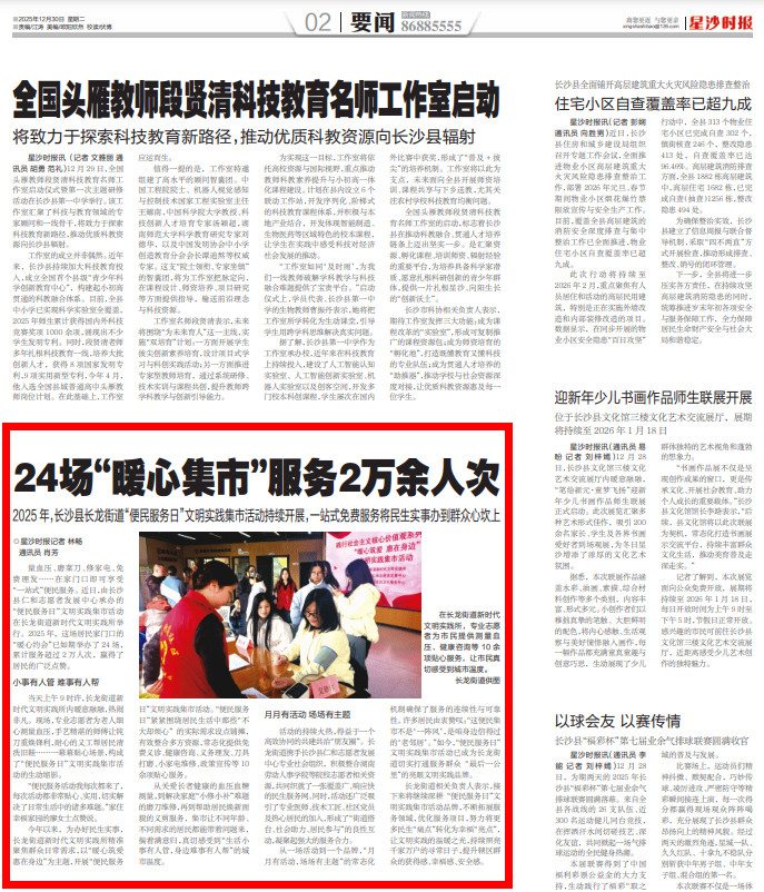 量血压、磨菜刀、修家电、免费理发……在家门口即可享受“一站式”便民服务。近日,由长沙县仁和志愿者发展中心承办的“便民服务日”文明实践集市活动在长龙街道新时代文明实践所举行。2025年,这场居民家门口的“暖心约会”已如期举办了24场,累计服务超过2万人次,赢得了居民的广泛点赞。