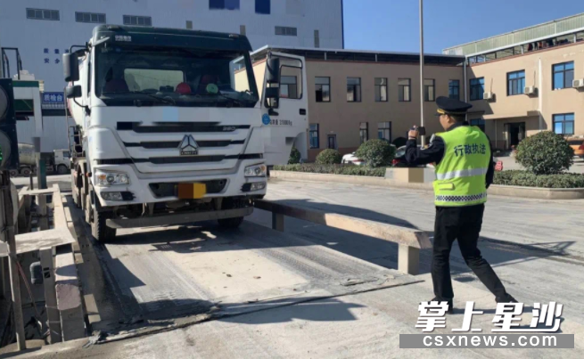 当天,在直属四中队联合长沙县交警大队的路警联合行动中,一辆车牌为湘AK7***的四轴重型特殊结构货车运输混凝土到长沙县东九路新城星悦城工地,途经开元东路与黄兴大道交汇处时,因涉嫌超限超载被查处。执法队员将车辆引导至黄花超限检测站,经称重检测,其车货总质量为53.25吨,超限22.25吨,监督其消除违法行为后,由长沙县交警大队开具了《违法行为处理通知书》。