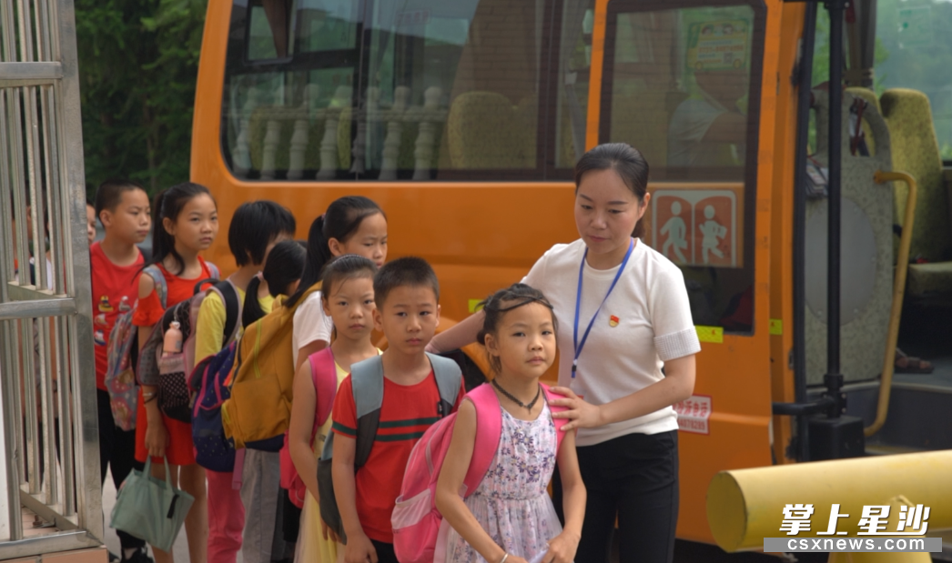 几分钟后,校车停在了北山镇高兴小学门口,一早来校门口值守的校长邬兰来不及吃完早餐,放下碗快步走到校车前:和随车照管员了解学生到校情况……孩子们依次下车,一声声亲昵地喊着“邬老师”“邬校长”“兰妈妈”。