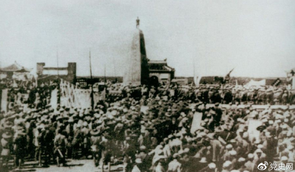 ▼1931年6月,红七军到达中央革命根据地江西兴国县,编入彭德怀率领的红三军团。图为当时会师的情形。