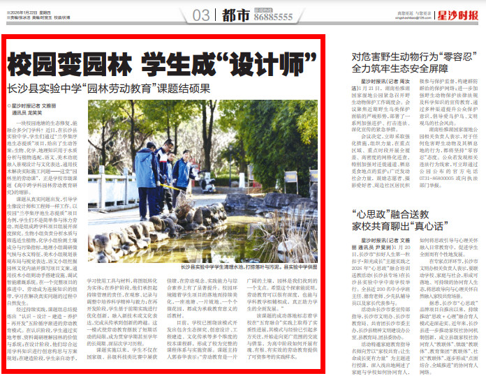 一块校园池塘的生态修复,能融合多少门学科?近日,在长沙县实验中学,学生们通过“兰亭集序池生态提质”项目,给出了生动答案:生物、化学、地理知识用于水质分析与植物选配,语文、美术功底融入景观设计与文化表达,通用技术解决实际施工问题——这堂“园林里的劳动课”,正是学校市级课题《高中跨学科园林劳动教育研究》的缩影。