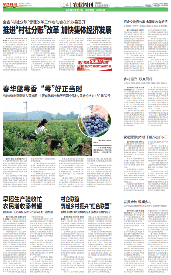 在推进“村社分账”工作、发展壮大新型村级集体经济上,长沙县创新举措,加大投入。2021年全县村级集体经济总收入为1.07亿元,145个村(社区)集体经济收入均达到25万元以上、经营性收入均达到6万元以上。2022年一季度,村级集体经济总收入6049.64万元,其中收入过50万元的村达19个。