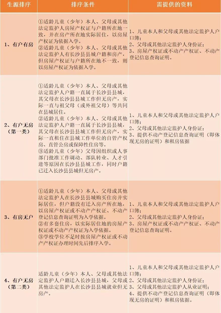 根据适龄儿童(少年)户籍和家庭住房情况,依据“房户一致”优先原则,在对应划定学区内按下列生源排序注册入学。
