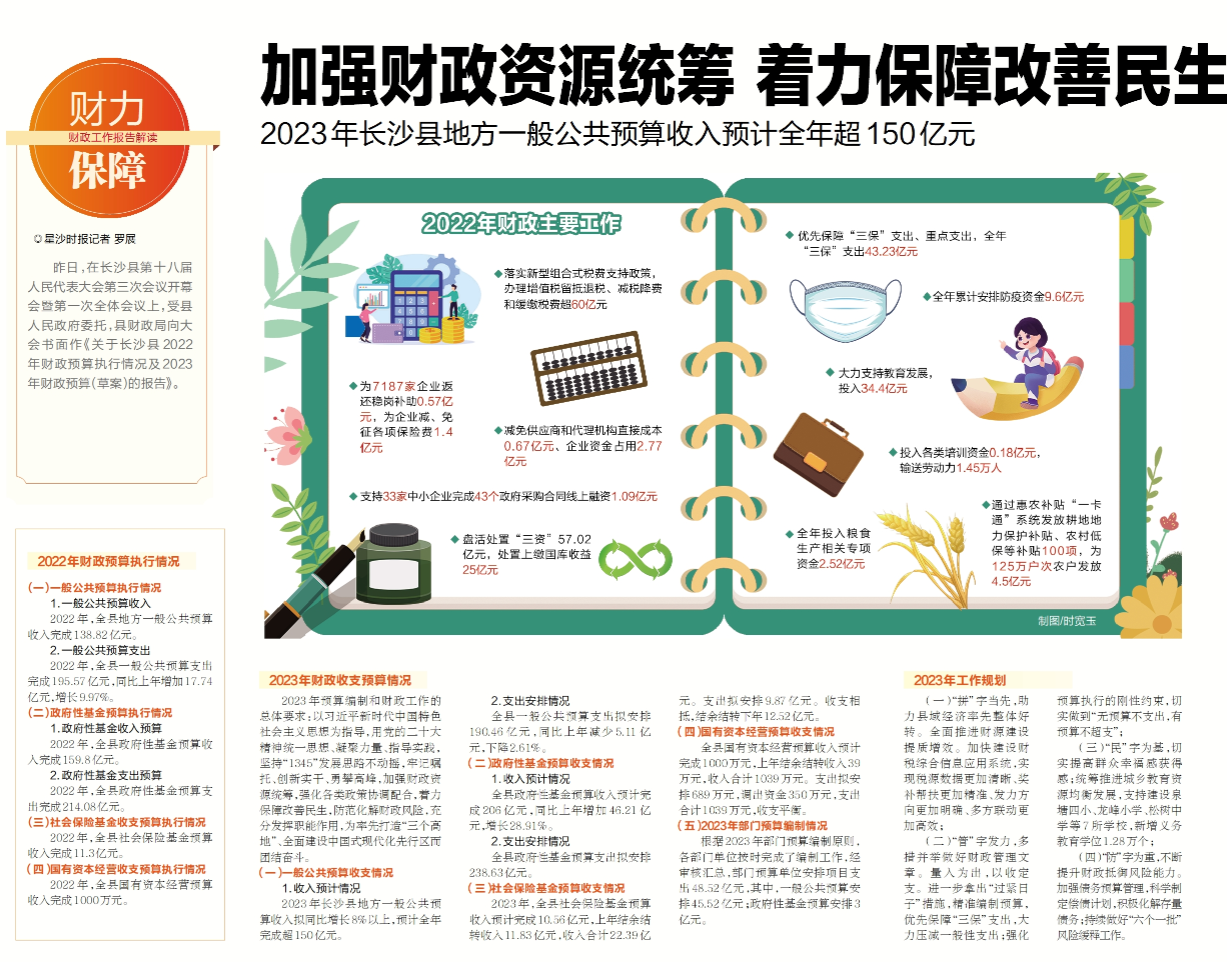 昨日,在长沙县第十八届人民代表大会第三次会议开幕会暨第一次全体会议上,受县人民政府委托,县财政局向大会书面作《关于长沙县2022年财政预算执行情况及2023年财政预算(草案)的报告》。