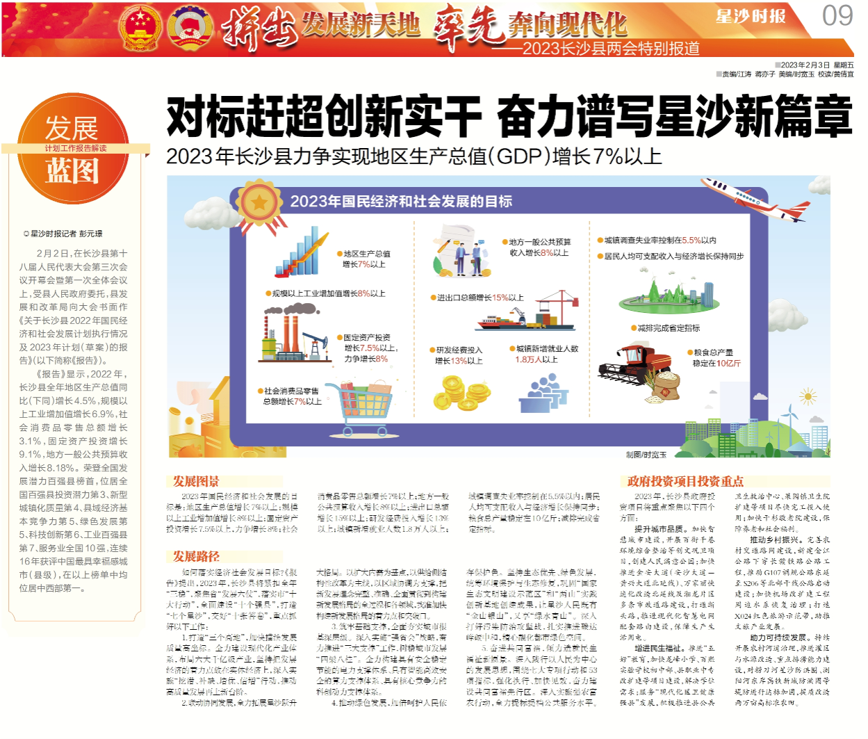 如何落实经济社会发展目标?《报告》提出,2023年,长沙县将紧扣全年“三稳”,聚焦省“发展六仗”,落实市“十大行动”,全面建设“十个强县”,打造“七个星沙”,交好“十张答卷”,重点抓好以下工作: