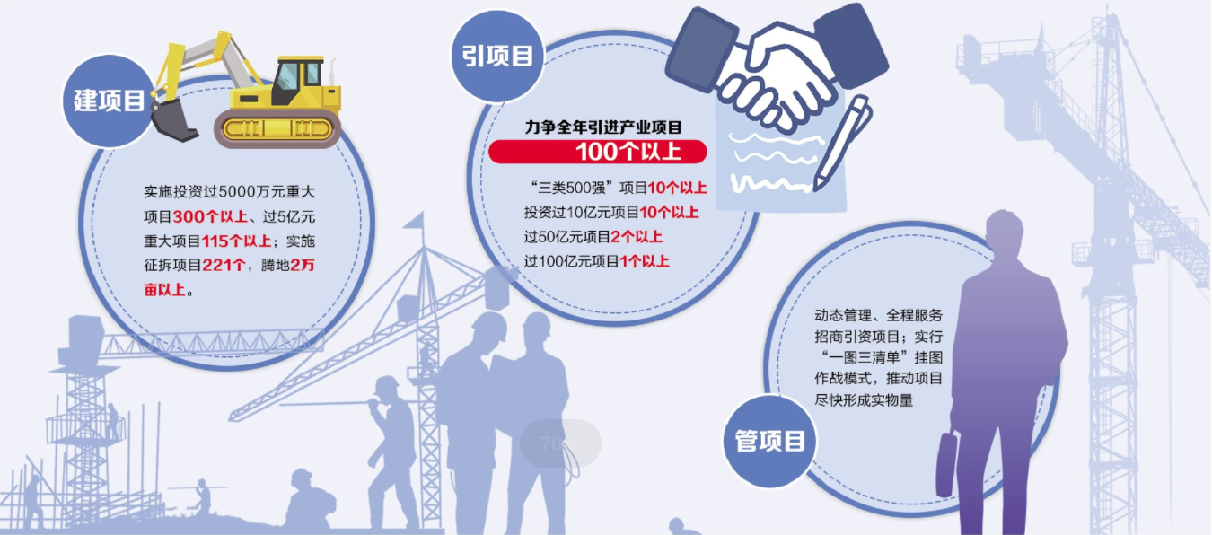 今年,我们将扎实推进“项目建设提速年”行动。按照“招引100、续建100、开建100、竣工100、达产100”和新建项目“一季度开工率60%以上、二季度开工率80%以上、三季度开工率100%”的要求,全力推动项目早开工、早落地、早见效。突出产业项目、基础设施项目、民生保障项目,加强各类要素保障,推动各类重大项目提速投产达效。