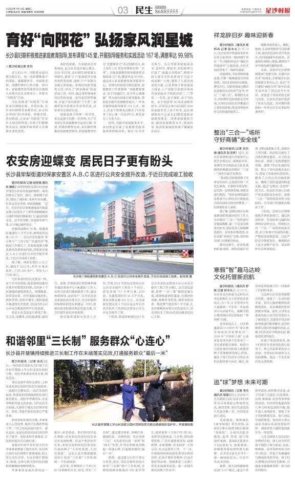 安装改造路灯76盏,畅通消防通道约3万平方米,新增监控设备140个……在长沙县住建局“多方参与”“三问于民”“共建共享”等推进工作模式下,㮾梨街道着力解决群众急难愁盼问题,对保家安置区A、B、C区进行公共安全提升改造,于近日完成竣工验收。