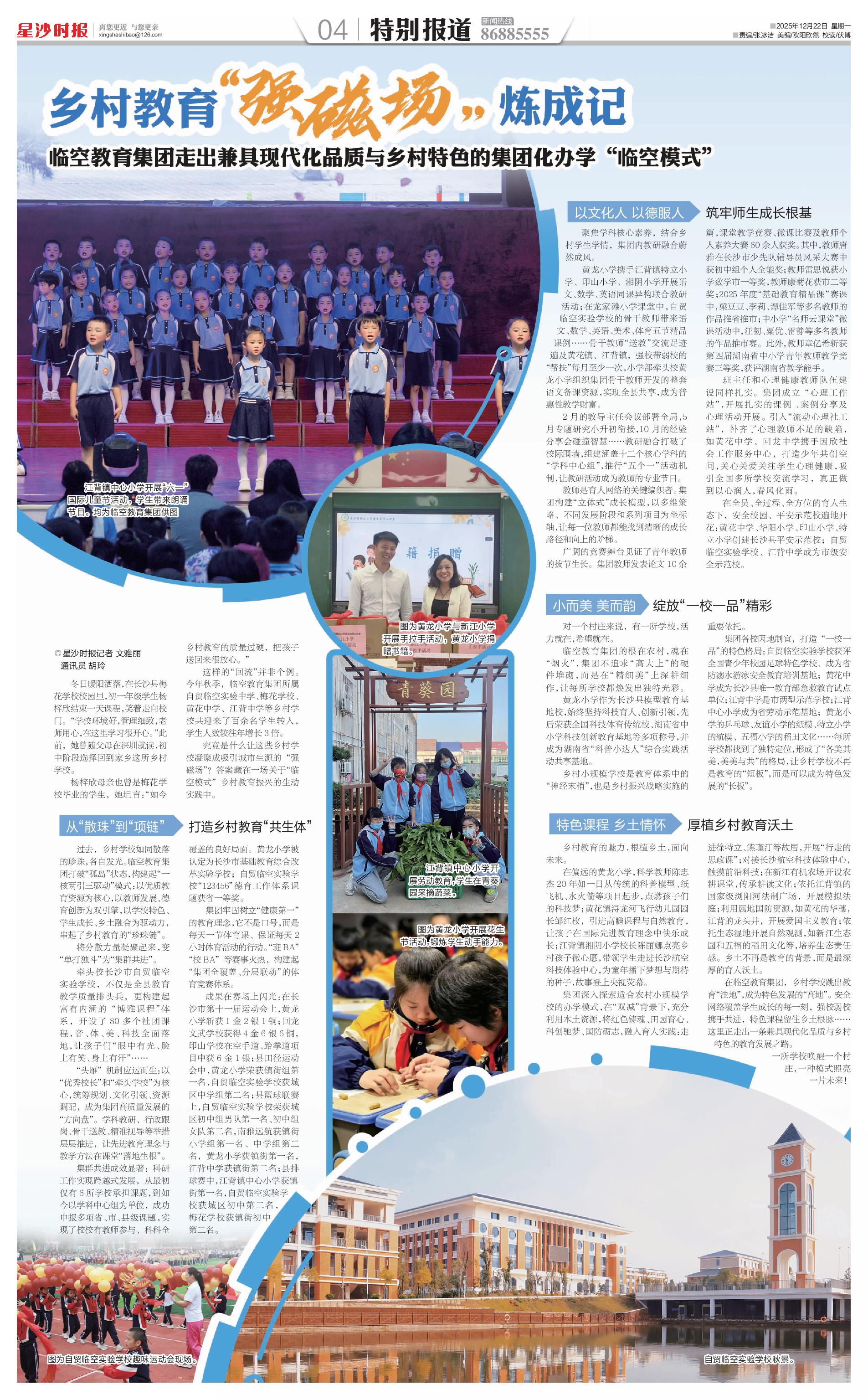 集团深入探索适合农村小规模学校的办学模式,在“双减”背景下,充分利用本土资源,将红色铸魂、田园育心、科创驰梦、国防砺志,融入育人实践:走进徐特立、熊瑾汀等故居,开展“行走的思政课”;对接长沙航空科技体验中心,触摸前沿科技;在新江有机农场开设农耕课堂,传承耕读文化;依托江背镇的国家级浏阳河法制广场,开展模拟法庭;利用属地国防资源,如黄花的华穗,江背的龙头井,开展爱国主义教育;依托生态湿地开展自然观测,如新江生态园和五福的稻田文化等,培养生态责任感。乡土不再是教育的背景,而是最深厚的育人沃土。