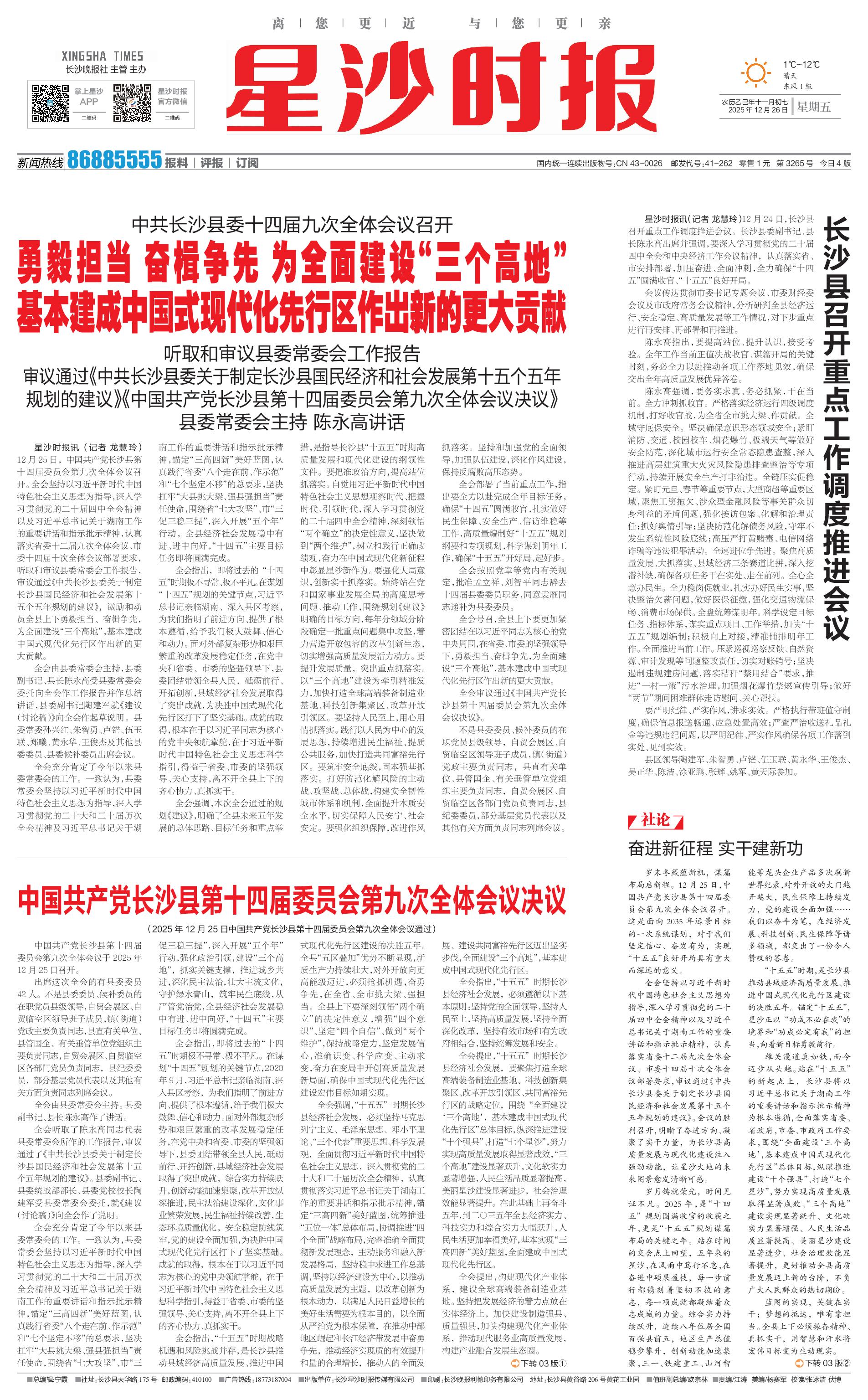 星沙时报讯(记者 龙慧玲)12月24日,长沙县召开重点工作调度推进会议。长沙县委副书记、县长陈永高出席并强调,要深入学习贯彻党的二十届四中全会和中央经济工作会议精神,认真落实省、市安排部署,加压奋进、全面冲刺,全力确保“十四五”圆满收官、“十五五”良好开局。