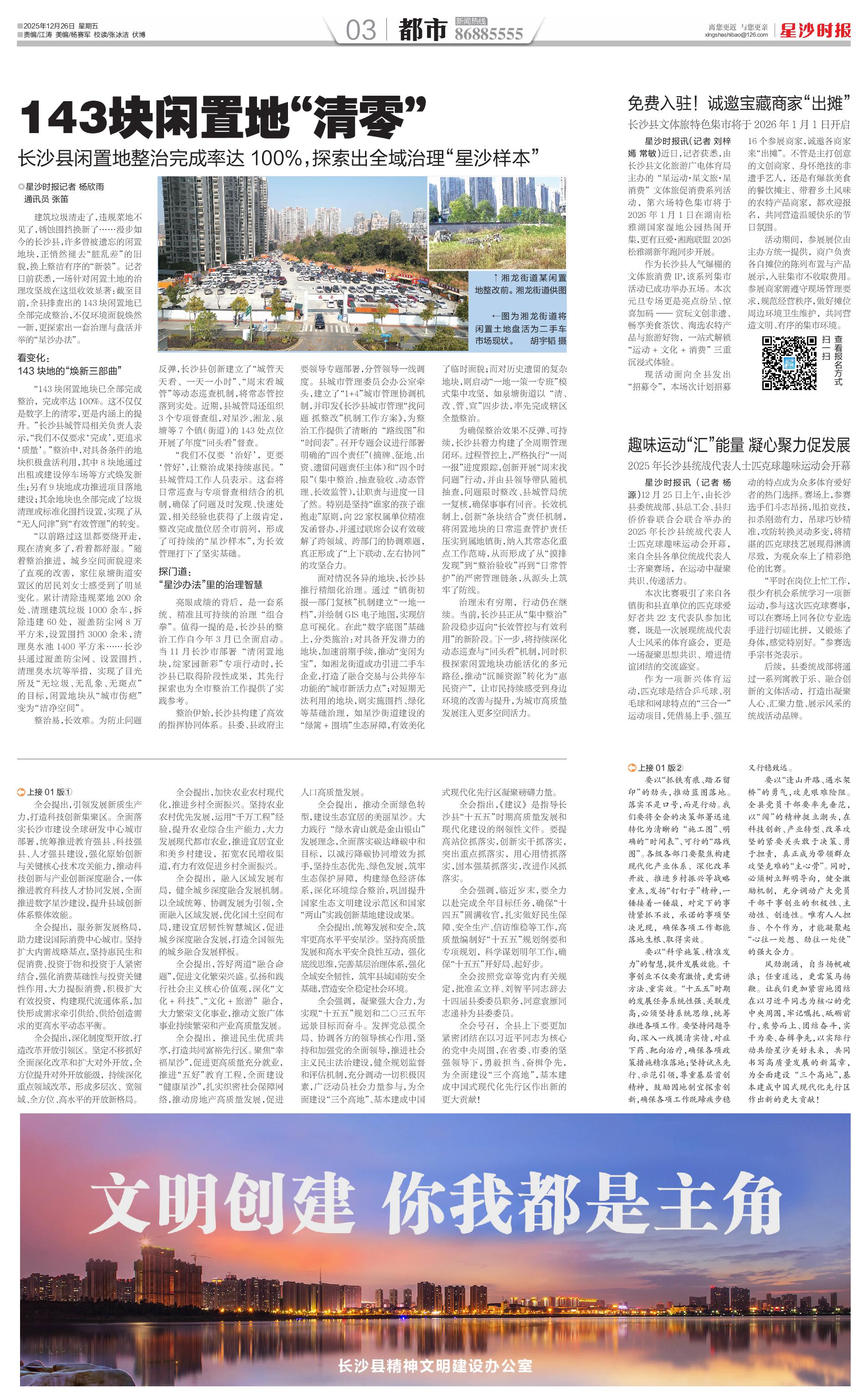 全会提出,推进民生优质共享,打造共同富裕先行区。聚焦“幸福星沙”,促进更高质量充分就业,推进“五好”教育工程,全面建设“健康星沙”,扎实织密社会保障网络,推动房地产高质量发展,促进人口高质量发展。