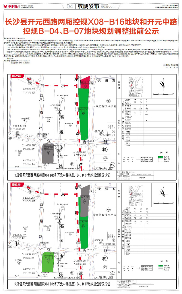 根据《中华人民共和国城乡规划法》《湖南省实施〈中华人民共和国城乡规划法〉办法》《中华人民共和国行政许可法》以及《长沙市城乡规划局规划公示公开规定》的有关规定,现将拟审批的修建性详细规划总平面图在星沙时报和我局互联网(http://www.csx.gov.cn/cxghjsj/)上进行公示,如对该规划调整有异议,请利害关系人持有关身份证明材料将意见与建议以书面形式反映到我局,公示起始日期:2017年12月8日起至2018年1月8日止,如申请听证的,应在公示期满后5个工作日内以书面形式向我局提出听证申请。逾期未将意见与建议反映到我局,则视为无异议并默认公示内容,我局将依法批准长沙县开元西路两厢控规X08-B16地块和开元中路控规B-04、B-07地块规划修改。