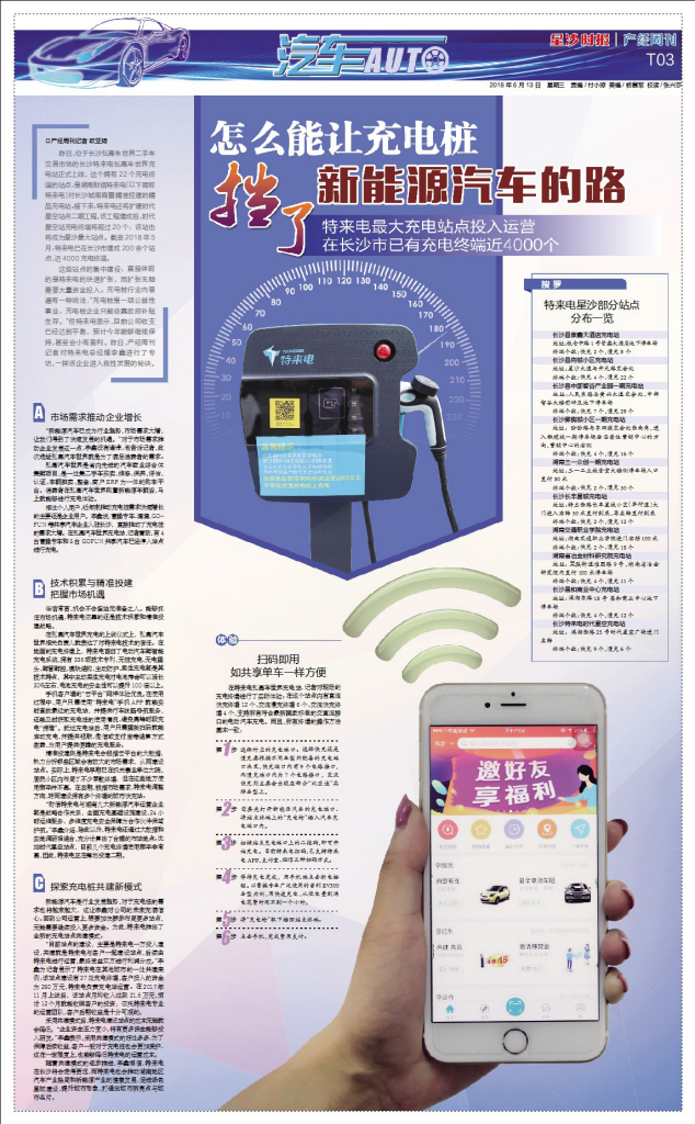 昨日,位于长沙弘高车世界二手车交易市场的长沙特来电弘高车世界充电站正式上线,这个拥有22个充电终端的站点,是湖南财信特来电(以下简称特来电)对长沙城南商圈精准投建的精品充电站。接下来,特来电还将扩建时代星空站点二期工程,该工程建成后,时代星空站充电终端将超过20个,该站也将成为星沙最大站点。截至2018年5月,特来电已在长沙市建成200余个站点,近4000充电终端。