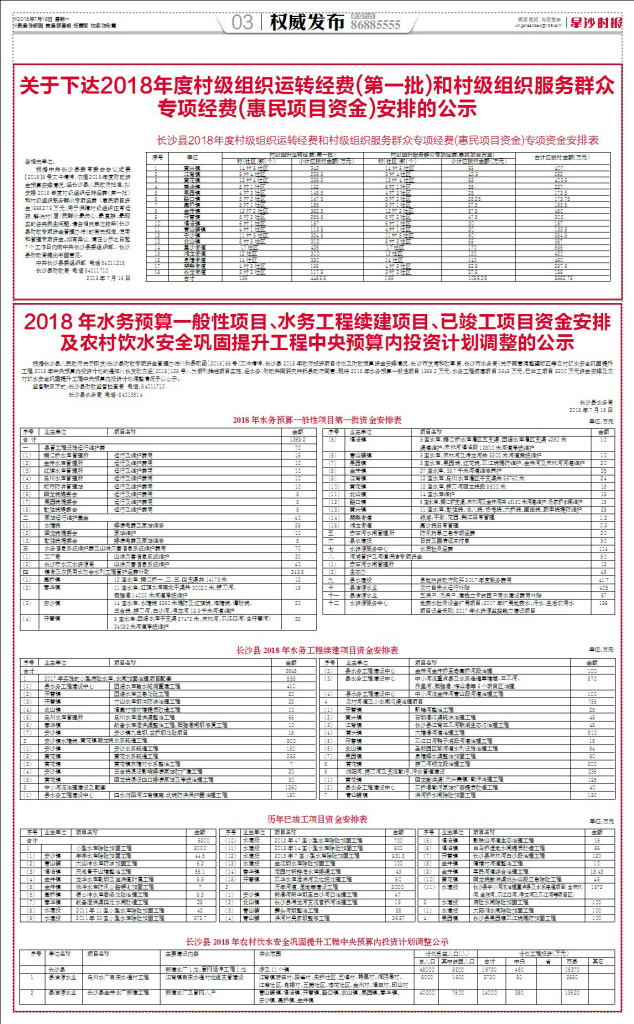 根据长沙县人民政府关于印发《长沙县财政专项资金管理办法》(长县政函〔2016〕65号)文件精神、长沙县2018年政府投资项目计划及财政预算资金安排情况、长沙市发展和改革局、长沙市水务局《关于同意调整望城区等农村饮水安全巩固提升工程2018年中央预算内投资计划的通知》(长发改农经〔2018〕128号),为顺利推进项目实施,经水务、财政共同研究并报县政府同意,现将2018年水务预算一般性项目1369.2万元、水务工程续建项目3645万元、已竣工项目5200万元资金安排及农村饮水安全巩固提升工程中央预算内投资计划调整情况予以公示。