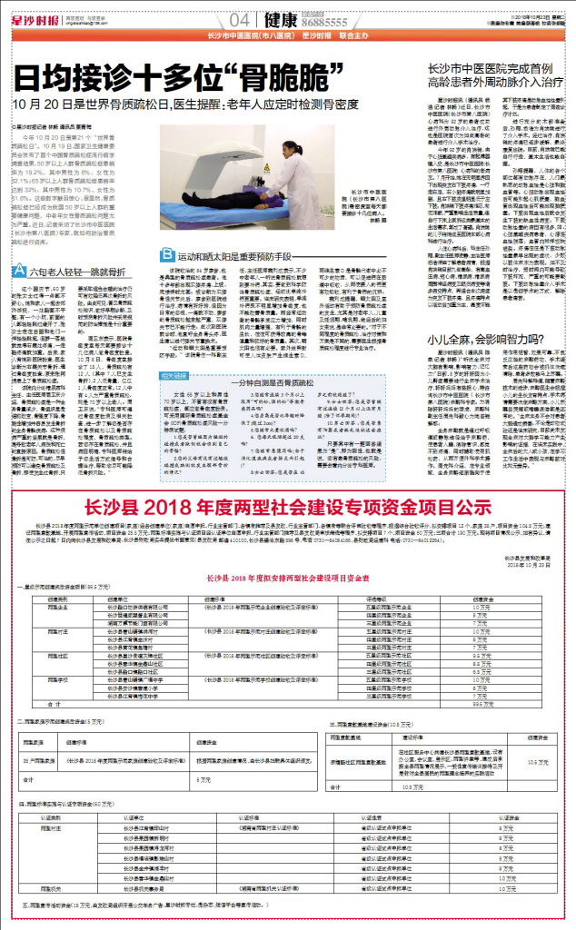 今年10月20日是第21个“世界骨质疏松日”。10月19日,国家卫生健康委员会发布了首个中国骨质疏松症流行病学调查结果,50岁以上人群骨质疏松症患病率为19.2%,其中男性为6%,女性为32.1%;65岁以上人群骨质疏松症患病率达到32%,其中男性为10.7%,女性为51.6%。这些数字触目惊心,很显然,骨质疏松症已经成为我国50岁以上人群的重要健康问题,中老年女性骨质疏松问题尤为严重。近日,记者采访了长沙市中医医院(长沙市第八医院)专家,就如何防治骨质疏松进行咨询。