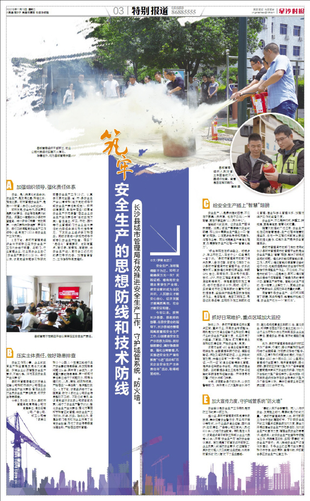 县城市管理局市政部门启动使用的长沙县城市管理局市政管理平台就是给安全生产插上“智慧”翅膀,解决了时间与空间的问题。通过多功能视频智能终端,工作人员可以通过智能终端查看设备的运行状态,也能根据提供的安全指标和预警指标来调整生产作业。不仅如此,不论是市政部门个人还是单位,都可以通过智能终端进行远程管理,了解操作员的精神状态、查看生产细节等。智能化的生产活动,在一定意义上解放了人,更能让安全生产贯穿始终,实现效率与质量的共赢。