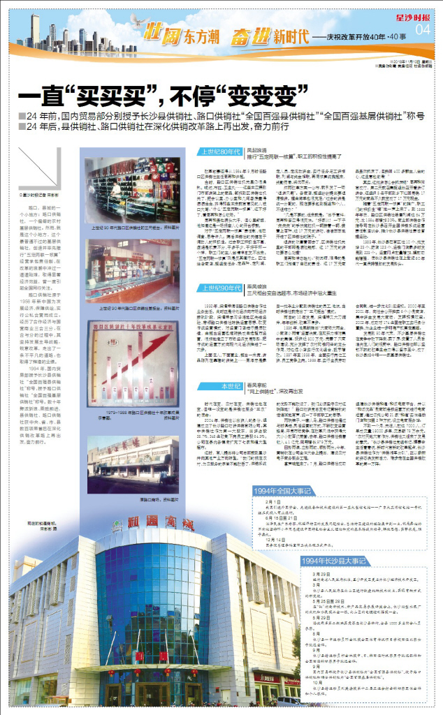 1994年,国内贸易部授予长沙县供销社“全国百强县供销社”称号,授予路口供销社“全国百强基层供销社”称号。数十年劈波斩浪、乘胜前进,县供销社、路口供销社获中央、省、市、县数百项荣誉后在深化供销改革路上再出发,奋力前行。