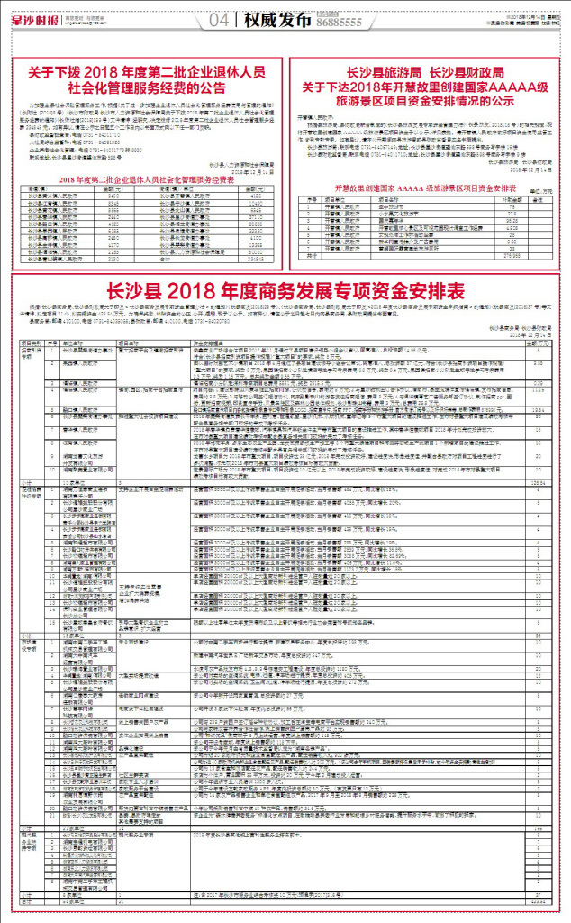 根据县旅游局、县财政局联合制定的《长沙县旅游发展专项资金管理办法》(长县旅发〔2018〕18号)的相关规定,现将开慧故里创建国家AAAAA级旅游景区项目资金予以公示,详见表格。请开慧镇人民政府做好项目资金使用监管工作,做到专款专用。如有异议,请在公示期间向县旅游局或县财政监督局实名书面提出。