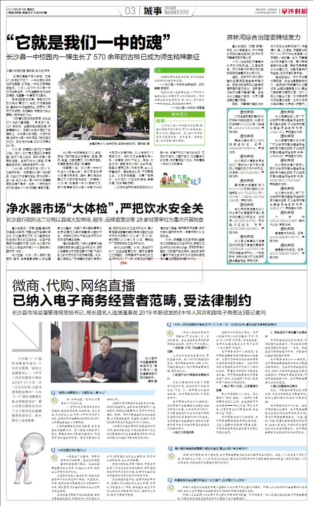 今天是“3·15”国际消费者权益日,今年的主题是“信用让消费更放心”。 《中华人民共和国电子商务法》也于2019年1月1日正式实施,这部法律有哪些亮点?今年“3·15”国际消费者权益日有哪些活动?星沙时报记者就此采访了长沙县市场监督管理局党组书记、局长提名人选饶逢春。